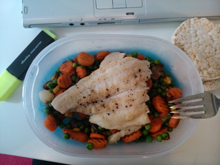 Oběd: Pangasius orestovaný na kapce olivového oleje, rýžové chlebíky a orestovaná směs zeleniny.