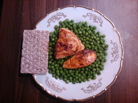 Večeře: Kuřecí prsíčka s hráškem a knackerbrotem. Přišla jsem na jednu věc, když se masíčko začne připalovat, tak podlít vodou, vznikne tak výborný sosík ;-)
