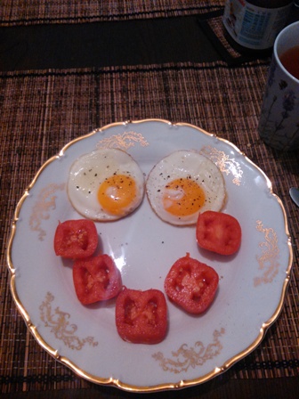 Druhý den jsem začala se snídaní a úsměvem. Udělala jsem si 2 volská oka, 2 knackerbroty, rajčátka. To samé jsem uvařila i přítelovi a den byl hned krásnější.